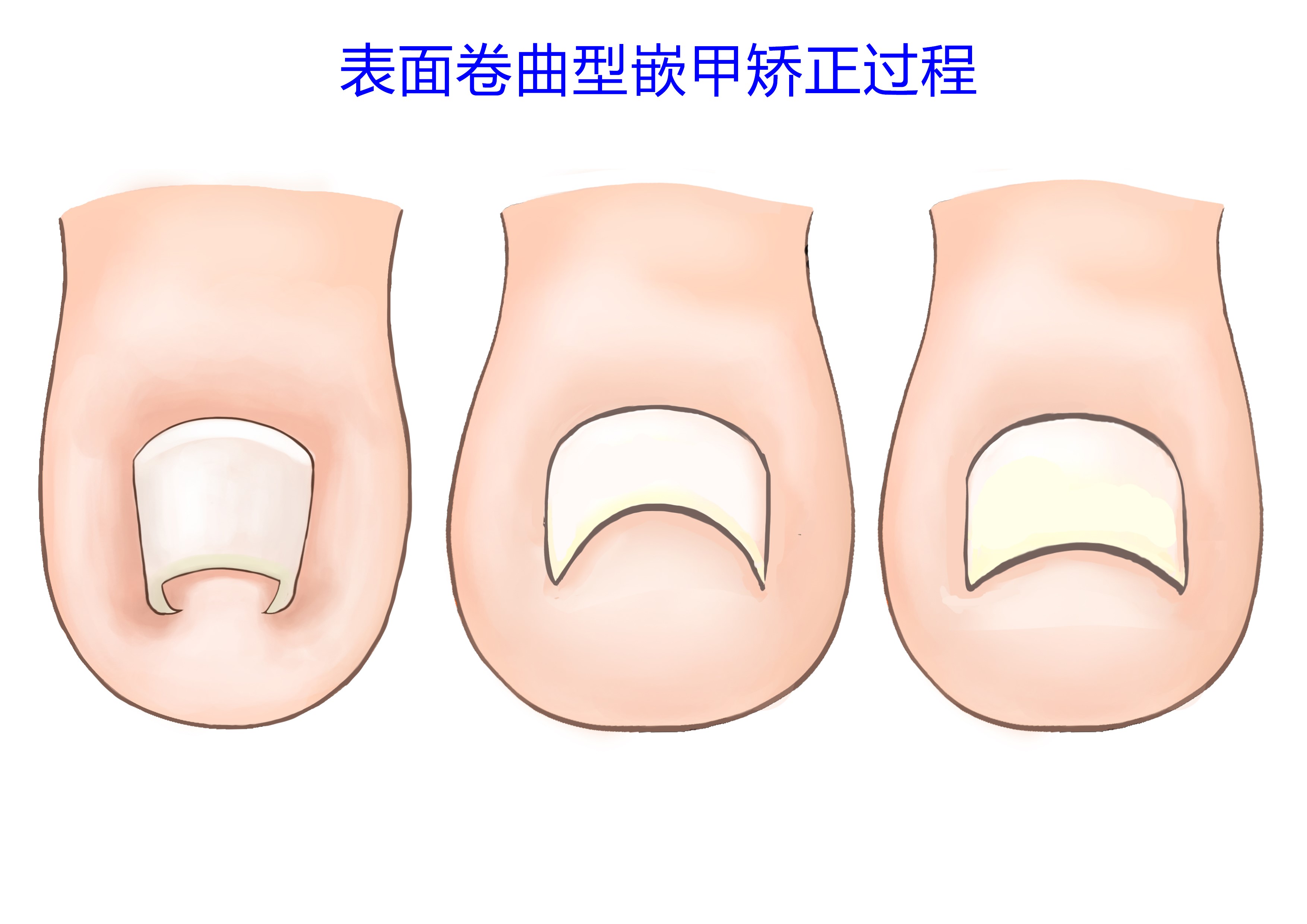 (1)表面卷曲型嵌甲甲沟炎,需要正甲贴改变指甲的弯曲程度,让指甲不在弯曲,恢复到自然弯曲程度,指甲就不会往肉里扎。