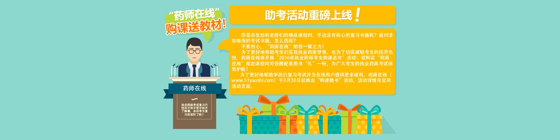 近期,面对难度不断加大的执业药师考试,为了帮助考生实现执业药师梦想,同时切实减轻考生的经济负担,药师在线开展了“2016年执业药师考生购课送书”活动,凡购买“药师在线”指定课程均可获赠配套图书。赠送图书包括《2016国家执业药师考试指南》、《2016国家执业药师考试辅导用书》、《2016国家执业药师考试冲刺试卷》、《2015执业药师真题试卷》、《2015执业药师真题试卷解析》等。关于本次买赠活动的详细介绍和购买流程详情见药师在线官方网站 (http://eb.51yaoshi.com/giftbook.jsp)。