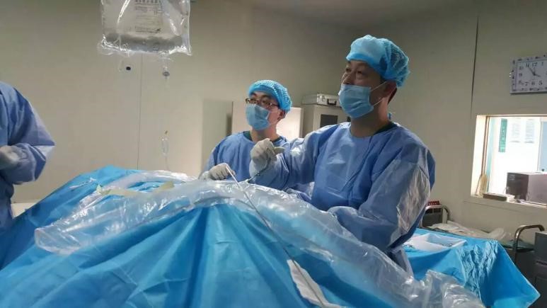 图为:王长勇院长带领助手为腰椎间盘突出患者实施椎间孔镜手术
