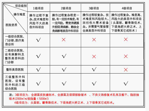 2009年12月21日,我国颁布《医疗美容项目分级管理目录》,对整形美容医院开展的项目细分为一、二、三、四级。即医疗美容诊所、美容门诊 部,或设有医疗美容科的一级综合医院可开展常规的一级美容项目;设有麻醉科的整形美容门诊部,或设有医疗美容科的二级综合医院可开展一、二级医疗美容项 目;美容医院可开展一、二、三级医疗美容项目;三级整形外科医院或设有整形外科的三级综合医院可开展一、二、三、四级整形美容项目。