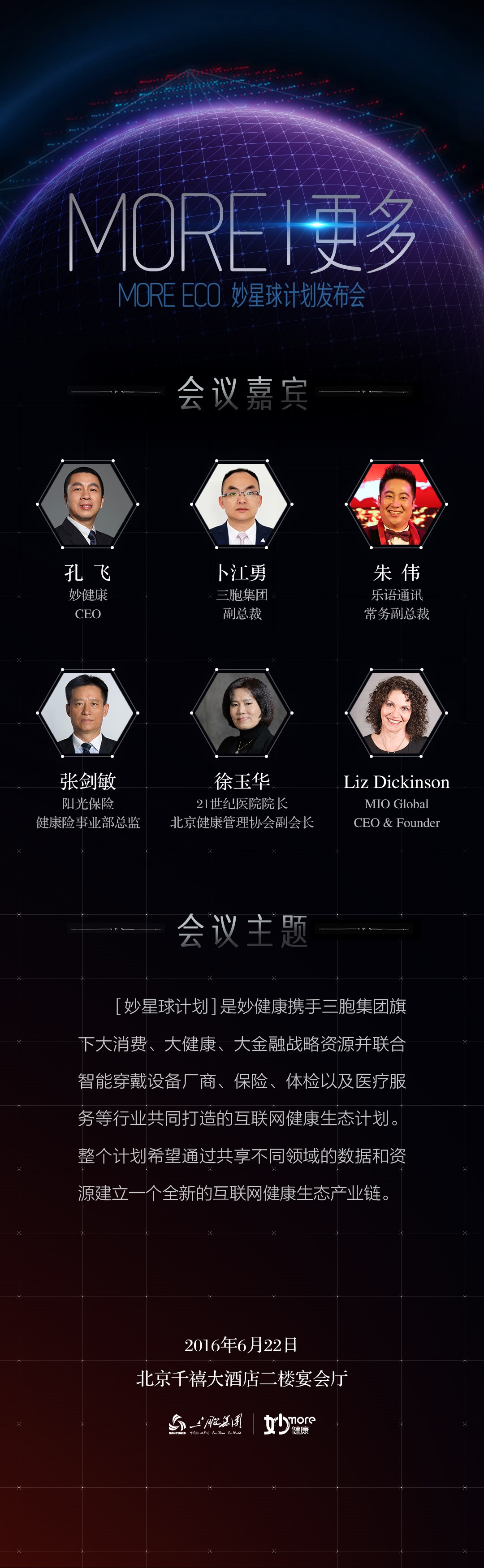 移动健康管理平台妙健康将于6月22日在北京千禧大酒店宴会厅举行主题为【MORE |更多】的生态发布会。