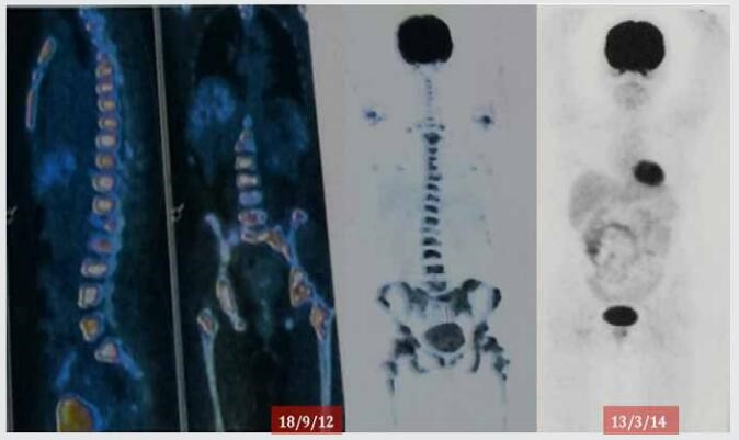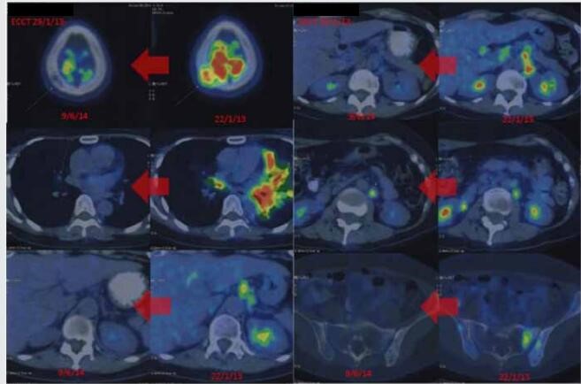 图C.案例研究三:女性,44岁,乳腺癌(4期),骨、肝、肺、脑、淋巴结转移:患者已行根治性乳腺切除术、放疗、化疗,但是肿瘤已经转移至骨、肺、淋巴结和脑(2013年1月22日PET-CT)。电场治疗前,患者一般状况弱,骨盆疼痛明显。电场治疗1-2月后,骨痛逐渐消失。电场治疗1年半后,PET-CT显示转移结节已经完全消失。患者目前一般状况良好,无并发症,肿瘤标记物在正常水平。