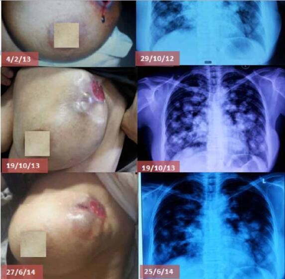 图B. 案例研究二:女性,51岁,乳腺癌肺转移:患者拒绝接受任何保守药物治疗。在治疗初期,她的左乳已经出现了开放性伤口(2013年2月4日),并且存在多发双肺转移结节。经过ECCT治疗6月后,乳房开放性伤口开始愈合,2013年10月19日胸部X线与2012年10月29日的影像相比,双肺结节进展受到抑制。治疗1年后,2014年6月25日的胸部X线提示两肺结节显著消失,乳腺肿块变软变小,伤口已经愈合。直到报告之前(2015年6月),患者仍然存活,且一般状况良好。