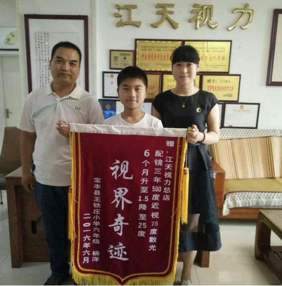 案例一:宝丰王铁庄小学六年级杨洋,初测双眼近视500度,散光75度,戴镜3年。治疗半年后,双眼视力1.5,度数25度,无散光,成功摘掉眼镜。