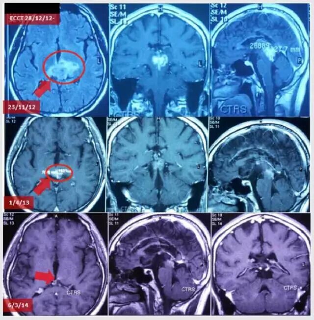 患者男性,22岁,诊断为松果体瘤,侵犯丘脑:肿瘤位于中脑(松果体区域)压迫丘脑(MRI 2012年11月23日),导致患者视力受损和严重头痛。ECCT治疗4月后,肿瘤体积逐渐缩小(MRI 2013年1月4日),患者症状持续改善。治疗15月后,MRI示肿瘤几乎消失(2014年3月6日),患者状况几乎回复正常。在这个病例里,肿瘤通过脑脊液流出道与第四脑室相连,因此死亡细胞可完全清除。单纯使用ECCT而不用手术有望完全消除整个肿瘤。