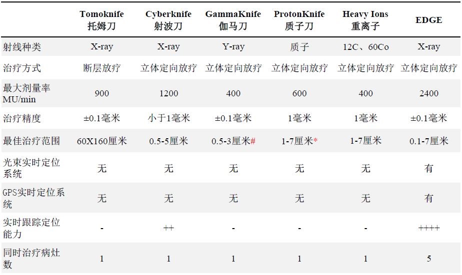 据全球肿瘤医生网报道,当今备受瞩目的精准放疗技术有托姆刀、射波刀、伽马刀、质子刀,还有2014年最新上市的EDGE(速锋刀)无创手术系统。这些技术各有利弊,但从治疗强度、治疗精度、治疗范围、定位系统、患者舒适度、副作用等几个方面进行综合对比,速锋刀是迄今为止最先进的肿瘤无创清除系统。