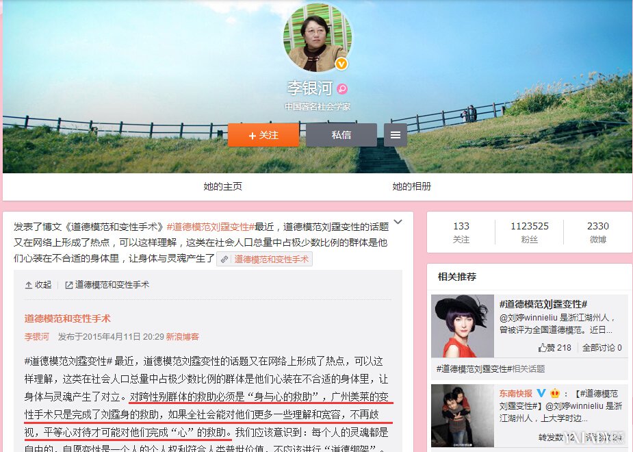 中国著名社会学家、首位性学女博士李银河多次在自己的博客和微博上公开支持刘婷