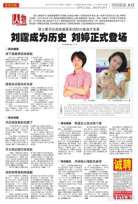 ·2014年8月14日,刘婷(刘霆)召开全国新闻发布会宣布 “本性绽放”,广州美莱成为刘婷(刘霆)实行变性手术公益援助机构。