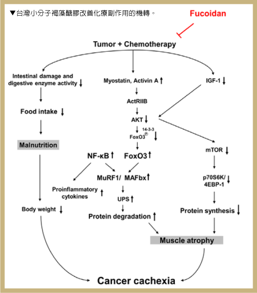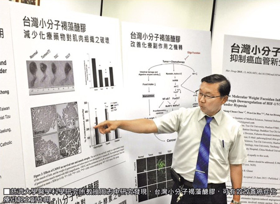 慈济大学医学科学研究所教授周志中耗费多年进行研究和实验,发现台湾小分子褐藻糖胶具有增加“肌肉蛋白生成”、“降低肌肉萎缩速度”、“保护肠胃道的代谢及吸收”三大功能,能明显改善化疗引起的体重下降、肌肉萎缩与消化道功能障碍等副作用,肌肉组织更是大幅生长,几乎恢复到化疗前状态。