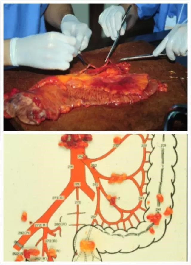 结肠癌区域淋巴结转移是一重要预后因素,西方国家对于任何肿瘤通常只进行D1-D2级淋巴结清扫,而日本会根据术前分期的结果选择性的进行D3级淋巴结清扫。在癌研有明医院,不管是年轻医生还是国际知名的教授主刀,每一台手术,淋巴结清扫的范围,结直肠肿瘤切除的距离,血管裸化到哪个程度,术中需要离断哪些血管……都必须严格遵照指南规定。指南规定距离肿瘤5cm切断,那就必须是手术中用尺量出来的5cm,不允许诸如“肉眼判断切缘干净了,凭经验感觉差不多了”之类的措辞。