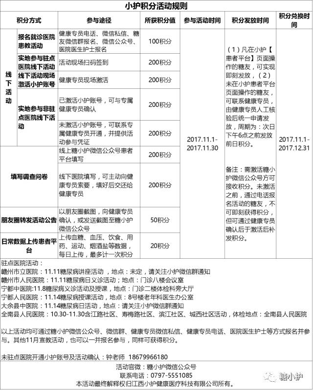 宜 参加活动 关注、点赞 转发朋友圈 九月十三 2017年11月1日 忌 看完就走 不拿积分 不兑礼物 2017年11月14日,我们迎来了第十一个“联合国糖尿病日”。各医院都将先后举办大型活动。为关爱广大糖友,小护将和各医院携手共进,一同加入到为糖友谋福利的大潮中。亲爱的糖友,您期待已久的糖小护积分活动第二季将于11.1正式起航。赣州区域的各位糖友都有机会积分兑奖。 本活动分两步走: 第一步,2017.11.1-2017.11.30通过糖小护微信公众号、患者平台、电话、微信群、医院医生护士报名并现场参与活动,可获取积分; 第二步,2017.11.1-2017.12.31通过【糖小护微信公众号】,进入【个人中心】或【患者平台】,登录【积分商城】,兑换礼品。具体操作方法可点击:积分活动第二季11月即将开启,各种礼物都能兑,您准备好了吗? 获得积分形式: 1、报名并参与线下宣教活动 可通过糖小护微信公众号、微信群、健康专员微信私信、健康专员电话、医院医生护士等方式报名并参与线下活动。 2、填写调查问卷 线上线下均可填写,线上请进入【小护患者平台】页面填写,线下可向驻点医院健康专员索要问卷填写后返还。 3、转发活动公告 请将转发截图向健康专员确认,或将截图发送至糖小护微信公众号后台。 4、日常数据上传 将日常血糖、血压、饮食、用药、运动、烟酒盐等身体数据上传至小护【患者平台】,每日上传,双倍领取积分,最多计一次积分。 驻点医院活动: 11月驻点医院糖尿病日活动: 赣州市立医院:11.11糖尿病讲座活动,地点:未定,请关注小护微信群通知 赣州市人民医院:11.11糖尿病日义诊活动;地点:门诊八楼会议室 宁都中医院:11.8糖尿病义诊活动及授课,地点:门诊二楼体检科旁大厅 宁都人民医院:11.14糖尿病授课活动,地点:8号楼老年科医生办公室 大余县中医院:11.14糖尿病日活动,地点:请关注小护微信群通知 全南县人民医院:10.30-11.30含江路社区、寿梅路社区、滨江社区、城西社区糖尿病高血压患者免费健康体检和居民血糖筛查活动,体检地点:全南县人民医院 以上活动均可通过糖小护微信公众号、微信群、健康专员微信私信、健康专员电话、医院医生护士等方式报名并参与。其他11月宣教活动,也可以一并报名参与,同样可获得积分。 积分细则: 双击可查看大图,积分兑大礼哦△△△ 联系方式: 活动官微:糖小护微信公众号 联系电话:0797-5551085 本活动最终解释权归江西小护健康医疗科技有限公司所有。 我是积分礼物分割线 拓展阅读 积分活动第二季11月即将开启,各种礼物都能兑,您准备好了吗? 【控糖活动】十万红包等您拿,为您控糖来积分 钱多事少离家近,小护招人啦,健康专员、业务拓展,还有CEO储备,总有一个适合你! 感恩凝聚 共赢未来——2017江西小护户外拓展培训开营啦! 小护受邀参加中国心脏大会(CHC 2017),来看看现场说了什么! 沙河卫生院分级诊疗帮扶活动中,小护也来和糖友们见面了! 糖小护协助市立医院举办糖尿病筛查活动,齐心协力关爱糖友 小护携手全南卫计委共建慢病管理项目,协力推进区域性慢病管理合作 热烈祝贺小护通过英国标准协会ISO27001信息安全体系认证审核