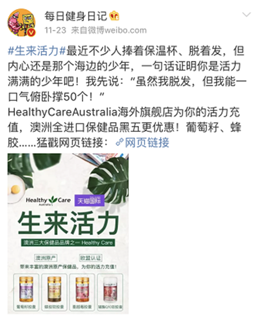 “生来活力”的话题在微博上也同样引起了广泛关注,微博大V们纷纷转发助阵。“一句话证明你是活力满满的少年”,诸如此类的方式带动着更多的人参与到活力话题的讨论中来,为Healthy Care的主题活动成功蓄力。