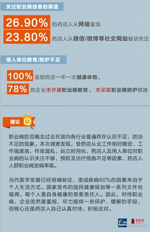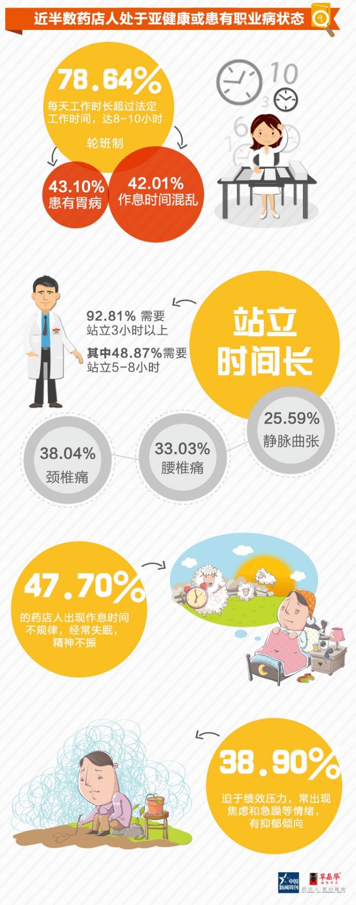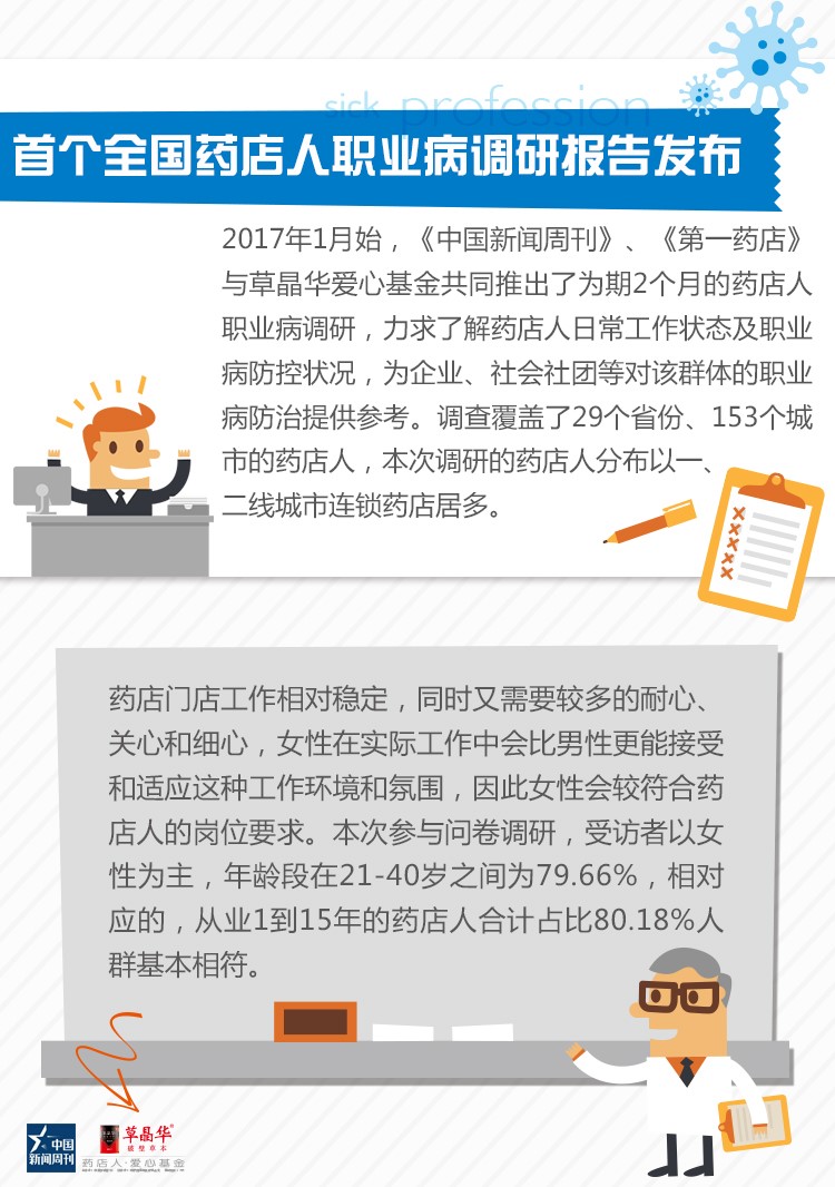 日前,由《中国新闻周刊》与“草晶华爱心基金”共同发起的主题为“药店人职业病大调查”报告出炉,调查历时2个月,调查面覆盖了29个省份、153个城市的药店人。报告显示,43.10%药店人反馈患有一种或多种职业病或相关症状症状,药店人健康状况不容乐观。报告同时指出,职业病成因与他们的工作时长、工作强度大相关之外,药店人对职业病的认识及防范意识亟待提升。