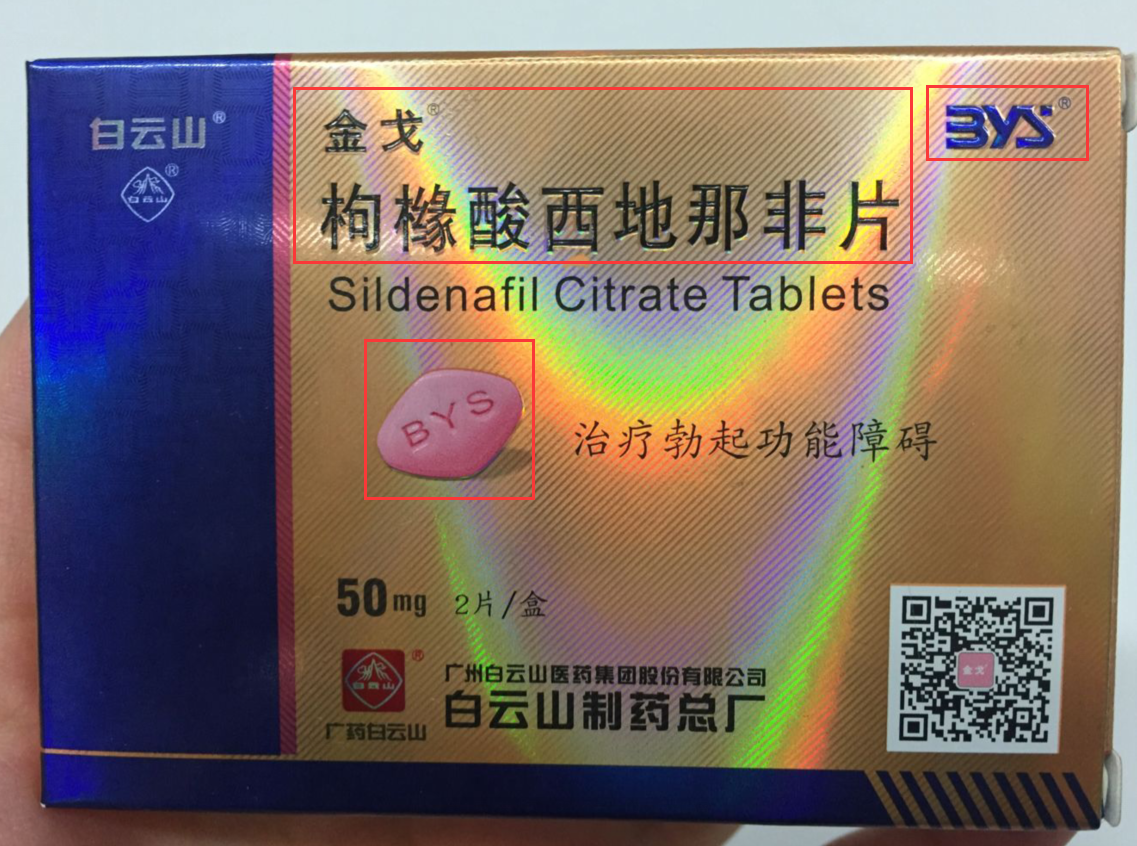 金戈外包装精美,覆有一层光滑的薄膜,在光线下反射出美丽的“彩虹”。用手指触摸金戈外包装正面的“金戈”、“枸橼酸西地那非片”、“BYS”和“小药片”等字样皆有明显的凹凸触感。