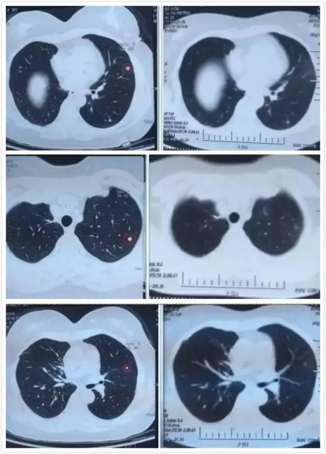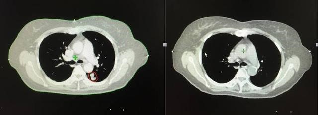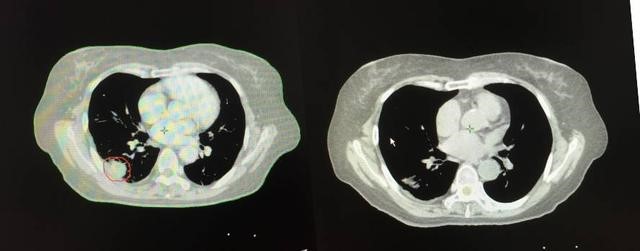 左图红色圈内是A45治疗前三个肺癌病灶,右图为治疗后病灶消失