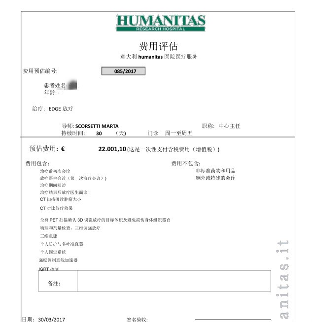 据报道,意大利整体医疗水平连续多年在全球排名第一,在癌症治疗方面更是处于世界领先地位。humanitas医院位于意大利米兰,是欧洲排名前三的医院之一,是意大利乃至整个欧洲最大的教学和研究型医院之一,它是一个高度专业化的医院,装备有最新的一代的技术,是目前世界上3家可以提供最先进立体定向放疗手术(SBRT)-速锋刀(EDGE)治疗的医院之一,也是欧洲速锋刀培训基地。该医院管理模式先进,其医疗质控体系曾被《哈佛商业评论》报道,为患者提供全球最好的医疗服务和就医环境。
