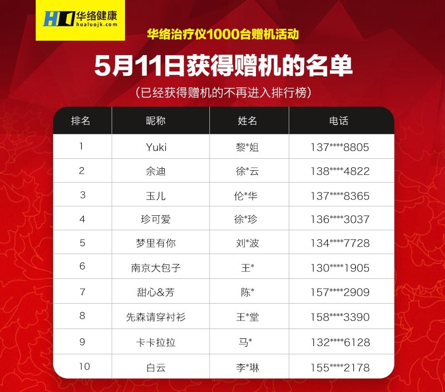 “华络治疗仪1000台赠机活动”(首期100台) 推出后,受到大家热烈追捧。现已经送出40台机,以下是4天来获得我们的华络疼痛治疗仪的40位用户名单。