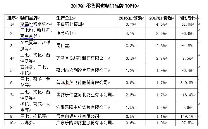 而从2017年第一季度零售渠道畅销品牌TOP10来看,中智药业集团生产的草晶华破壁草本,康美药业生产的三七粉、新开河、菊皇茶,以及同仁堂生产的冬虫夏草、西洋参等药品分列排行榜前三位。其中,以草晶华破壁草本品牌领跑榜单,销售同比增长51.0%。