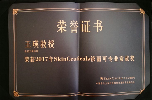 2017年4月20日,在上海黄浦江畔举行的“修丽可”专业贡献奖荣誉颁奖典礼上,我国知名美容皮肤科专家王瑛医生作为获奖的8位医生之一获此殊荣。此次颁奖盛典由中国非公立医疗机构协会皮肤专业委员会和“修丽可”SkinCeuticals品牌共同发起,由复旦大学华山医院皮肤科项蕾红教授以及国际青年钢琴大师李云迪先生等作为颁奖嘉宾。