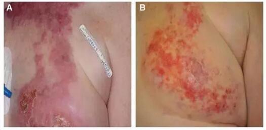 一名58岁的女性,罹患难治性乳腺癌。她具有三阴性乳腺癌主要特征(ER / PR / HER2均阴性)。身体检查显示乳腺皮肤红斑,局部温度升高和硬结。因为肿瘤转移到下丘脑,她出现吞咽困难。