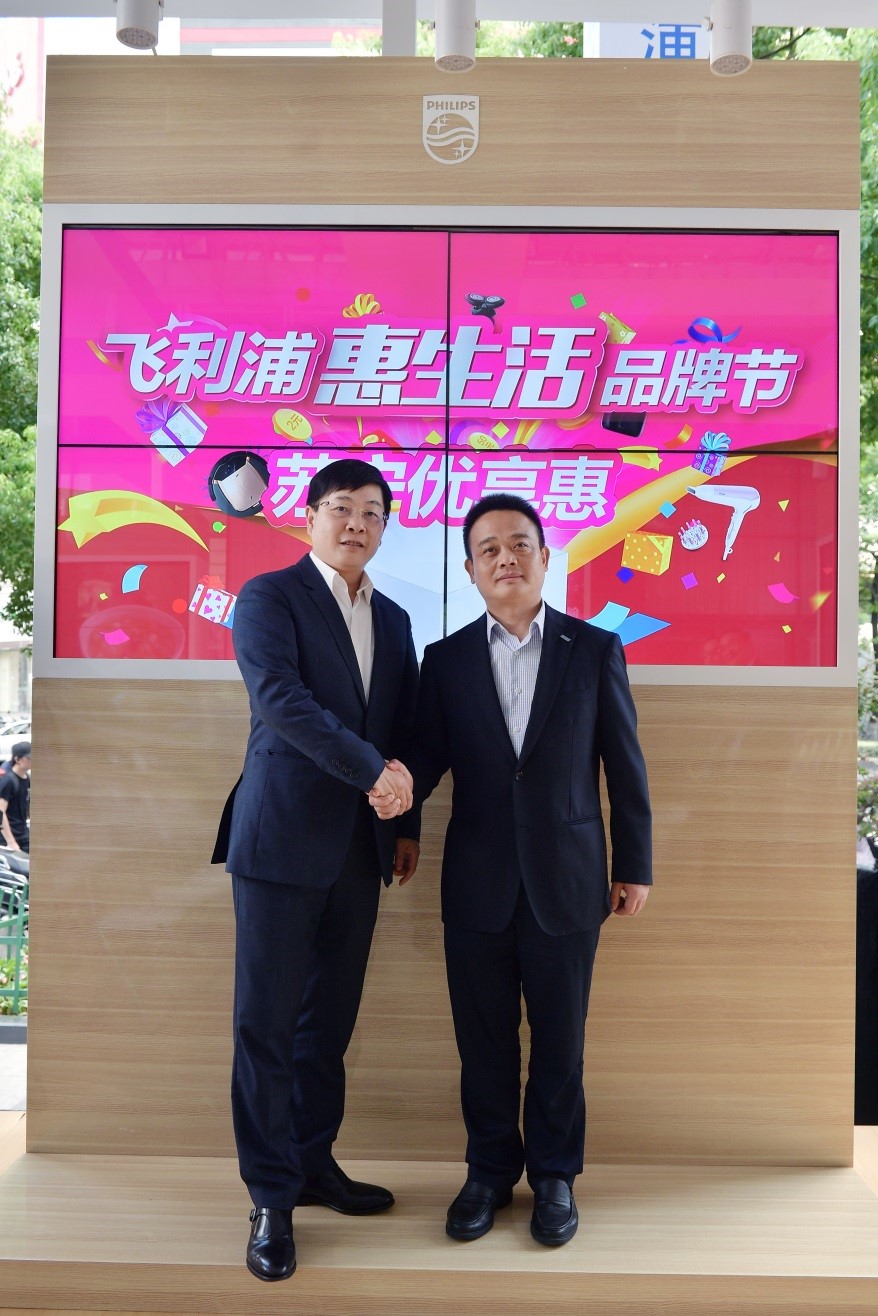 飞利浦大中华区健康生活事业群总裁钟鸣(左)、苏宁云商集团COO侯恩龙(右)启动飞利浦惠生活品牌节苏宁首发