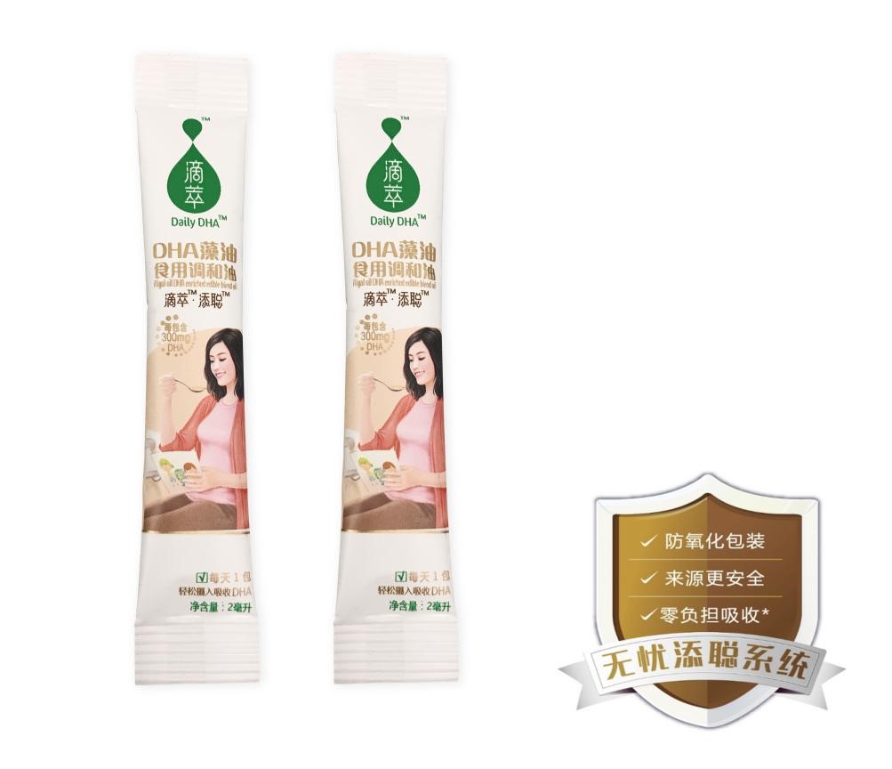 滴萃添聪DHA藻油,选用植物性DHA,优选纯天然单细胞海藻为原料,天然无腥味,是专为备孕期,怀孕期以及哺乳期妈妈膳食补充设计的一款首创随餐食用油型的DHA藻油。