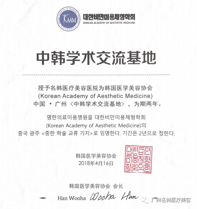 广州名韩医疗美容医院自成立即展现不凡,继与北京大学人民医院达成战略合作成立整形美容联合诊疗中心后,名韩医疗美医院又传重大喜讯——韩国医学美容协会指定广州名韩医疗美容医院为中韩学术交流基地!