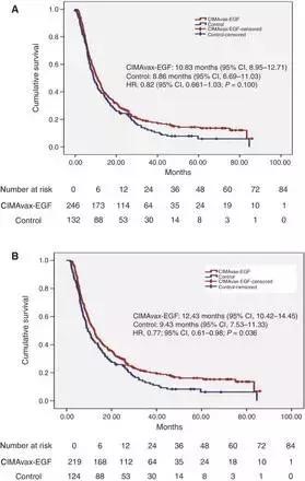 疫苗治疗组的中位生存期为12.43个月 (95% CI, 10.42–14.45) ,对照组为9.43个月 (95% CI, 7.53–11.33)。EGF浓度高的患者接种疫苗后,中位生存期更长(14.66个月)。五年生存率分别为16.62个月和6.22个月。具有显著的生存获益。