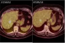 CT扫描显示治疗前肝病变(左图)和FOLFIRI治疗后(右图)