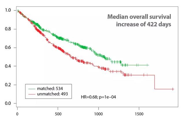 一项1180名实体瘤患者参与的大型研究显示,接受凯瑞思多平台分子检测指导治疗患者与对照组患者对比,死亡风险降低了32%,中位总生存期延长422天!