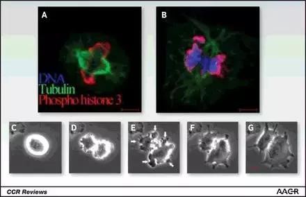 电场影响中期的正常纺锤体形成。对照细胞(A),电场处理的细胞(B)。A和B用磷酸化组蛋白3(有丝分裂细胞标记)染色。C-G,处理的细胞随时间推移,显示在末期期间膜起泡(这是癌细胞死亡的一个标志特征)(箭头)。
