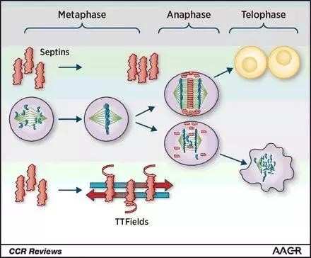 电场模型导致有丝分裂中断。电场能够通过破坏单个纤维相互结合的能力来抑制晶格形成的传播。随后使癌细胞出现异常有丝分裂。