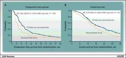 根据该研究的临时数据,电场治疗显着改善患者PFS和OS,该试验于2014年11月由独立数据监测委员会提前终止。随后,电场联合替莫唑胺被FDA批准用于治疗新诊断的GBM。对于新诊断的GBM患者,NCCN已推荐电场与替莫唑胺联合作为术后辅助治疗方案。