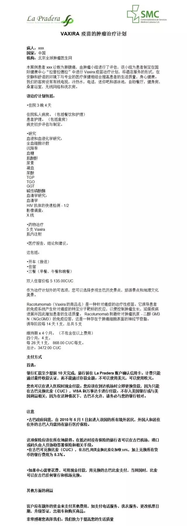 确认函很快下来了,古巴医院给出的方案是二代疫苗,接下来就是抓紧时间办理签证购买机票了。去古巴的旅游签办理很快,全球肿瘤医生网告诉潘先生,往返机票大概一万三左右,有法航、荷兰航空、俄罗斯航空和国航,建议选择法航和荷兰航空。