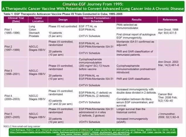 § 截至2016年,3000多名晚期非小细胞肺癌患者接受了CimaVax-EGF疫苗,显示其安全,免疫原性和适度有效。