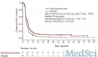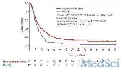 racotumomab组中位总生存期为8.23个月,安慰剂组中位总生存期为6.80个月(HR 0.63;95%CI 0.46-0.87;p=0.004)。racotumomab组中位无进展生存期为5.33个月,安慰剂组中位无进展生存期为3.90个月(HR 0.73,95%CI 0.53-0.99;p=0.039)。