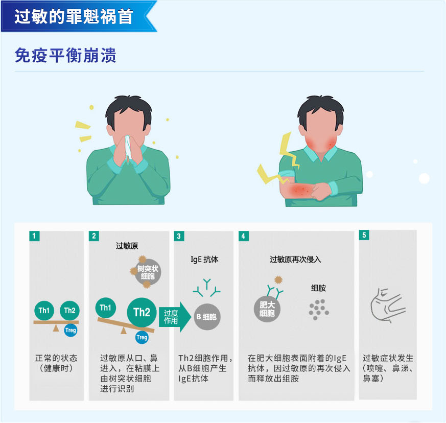 令人困扰的过敏其实是由于人体免疫系统失衡引起的,当过敏原从口、鼻进入体内时,免疫机构异常出现过度反应,产生IgE抗体。当过敏原再次侵入后,在肥大细胞附着的IgE抗体就会大量释放组胺导致过敏症状发生。经过研究表明,摄入「L-92乳酸菌」可以抑制IgE抗体的产生,调节免疫平衡,从而缓解过敏症状。