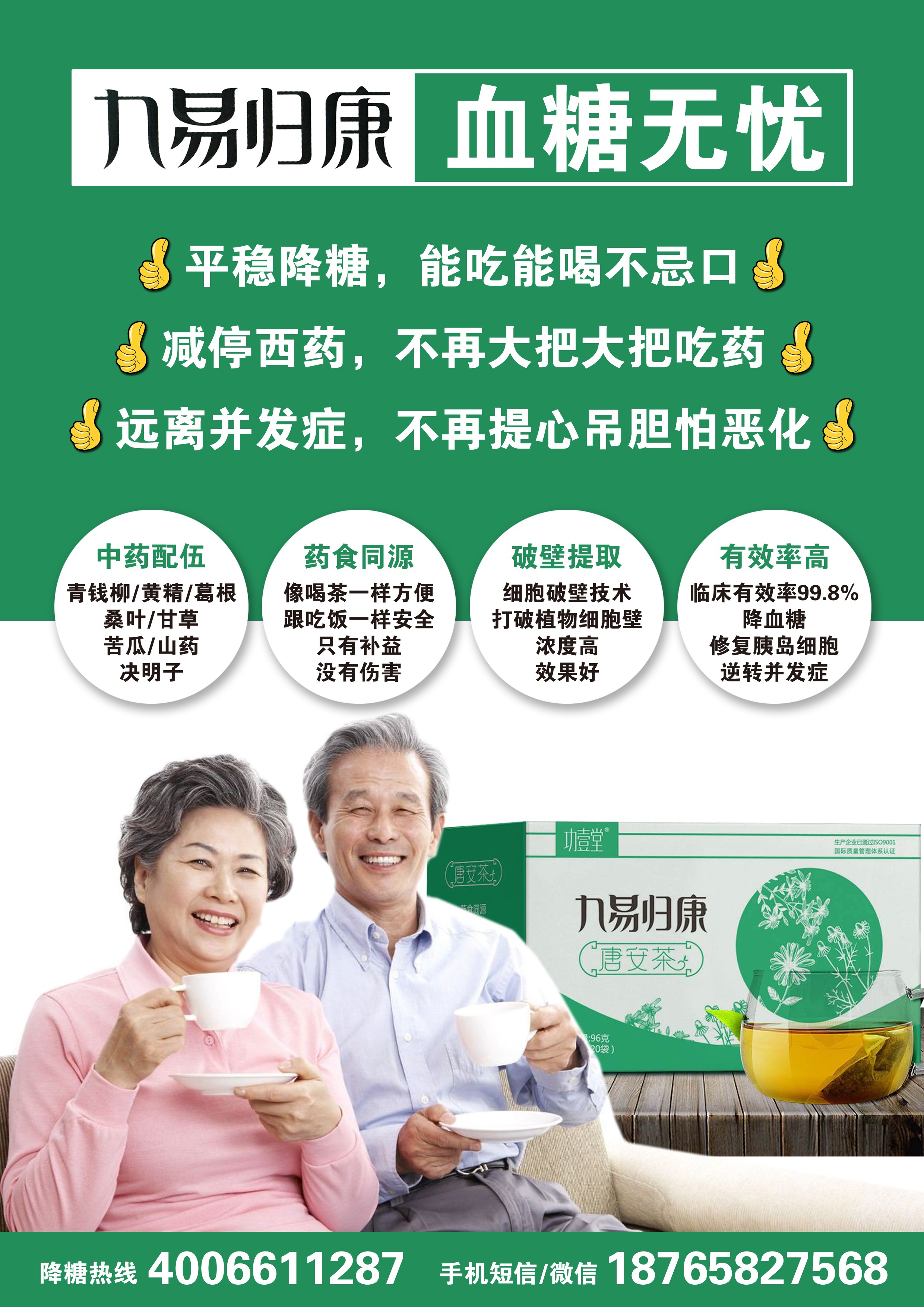 临床应用证实:【九易归康唐安茶】能够有效平衡人体糖代谢,改善糖耐量,从而达到降血糖、修复胰岛细胞、增加胰岛素敏感性、预防和逆转并发症的效果,临床有效率达到99.8%。
