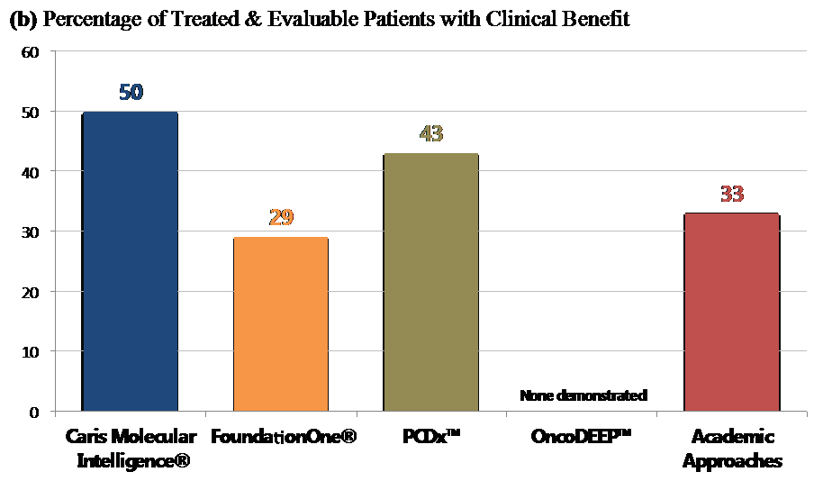 上述各种癌症经过基因检测指导治疗后,临床获益均可升高,并且凯瑞思多平台分子分析结果指导用药选择,临床获益比例远远高于其他美国知名基因检测公司,获益比例如下,凯瑞思50%、Foundation One 29%、PCDx 43%、OncoDEEP 暂无数据、Academic Approaches 33%,在美国这几家专业的癌症基因检测公司中,经过凯瑞思分子分析指导用药的患者获益比例最高。
