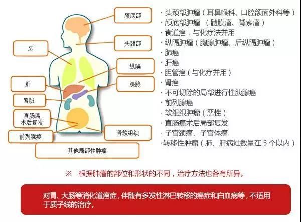 按理论上来讲,只要是适合放疗的患者都可以进行质子治疗。质子治疗的应用范围非常广,例如不能手术的癌症患者,不耐受化疗和放疗的患者,没有其他治疗选择患者,等等。涵盖身体几乎所有实体瘤(如下图),如肺癌、脑癌、前列腺癌、卵巢癌,但质子治疗病灶不能多于3个,不适用于多发转移的癌症患者。有意向进行质子治疗的患者可以咨询质子治疗医生,评估之后方可治疗,由于每个患者的身体情况都不一样,不能一概而论。