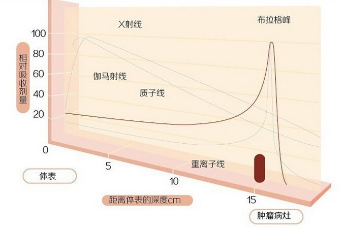 质子治疗是将失掉电子的氢原子原子核,利用回旋加速器或者同步加速器加速到光速约70%,以这种极快的速度穿透到人体内部,到达癌细胞所在的特定部位,速度突然降低并停止,在射程终点处形成一个尖锐的剂量峰,称为Bragg峰(“布拉格峰”),释放出最大能量,将癌细胞杀死。