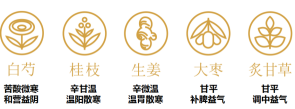 甘温质润之饴糖为君,温补中焦,缓急止痛。臣以辛温之桂枝温阳气,祛寒邪;酸甘之白芍养营阴,缓肝急,止腹痛。佐以生姜温胃散寒,大枣补脾益气。炙甘草益气和中,调和诸药,是为佐使之用。其中饴糖配桂枝,辛甘化阳,温中焦而补脾虚;芍药配甘草,酸甘化阴,缓肝急而止腹痛。六药合用,温中补虚缓急之中,蕴有柔肝理脾、益阴和阳之意,用之可使中气强健,阴阳气血生化有源。