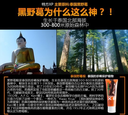 威特猛特方XP草药成分:由黑葛根(Mucuna Collettii)萃取18%精华制成,原产自泰国,唯有泰国出产这类草药,可搭配威特猛内用制剂,双管齐下达到更好的效果。