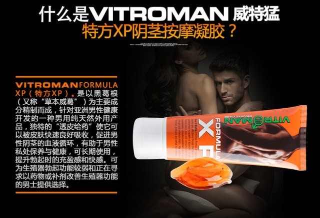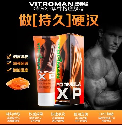 男性专用产品——威特猛 特方XP 阴茎按摩 凝胶 是以泰国珍稀天然植物黑葛根Mucuna Collettii (也被称为“草本威葛”),综合其它纯净植物精华精制而成,能给于阴茎肌肤保养和呵护。本品开创男性阴茎保养全面养护理念,突破单纯的保健方式,达到了(健、护、保)全方位的保养和呵护。它具有良好的穿透力能快速渗透阴茎皮肤层,确保有效成份渗透到阴茎皮下组织每一个细胞,使阴茎皮下细胞快速吸收所有营养元素和微量元素,增大增强结缔组织,使肌肤更健美。