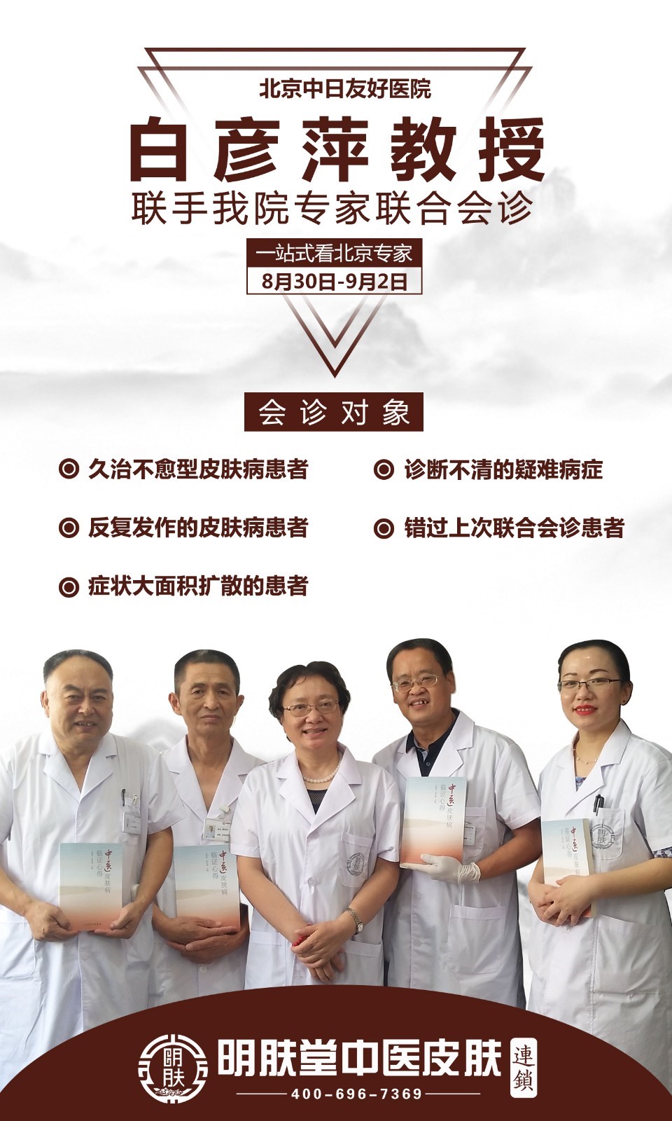 7月明肤堂全国大型皮肤病公益义诊6周年之际,我院诚邀北京中日友好医院主任医师、医学博士白彦萍教授,陈理森二代传人陈晓燕,三代传人陈帆,名老中医毋中华与我院名老中医强强联手,助力义诊,此次义诊,一站式解决了反复顽固性皮肤病患者看病难,看名老中医更难的现状,切实减轻泛发性皮肤病患者的经济负担,赢得患者超高称赞。很多因行程因素无法参加的患者表示十分遗憾,纷纷留言询问,何时再筹办类似活动?何时再把北京名医请来?由于申请人数较多,明肤堂院办处再次向上级申请,与专家洽谈行程,确定于8月30日-9月2日,再邀白教授前来,进行联合会诊,让更多患者不留遗憾,重获皮肤新生。
