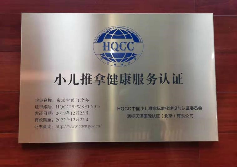 祖国传统医学小儿推拿自2013年列入“国家基本公共卫生服务项目”以来, 随着2019年8月中国小儿推拿标准化建设与认证委员会(以下简称HQCC认证)的正式成立,小儿推拿行业进入规范有序发展的重要里程。同年10月,东源中医率先成为广东省乃至华南地区首家进入认证的医疗机构。经过三个月的评审, 东源中医于2020年1月通过小儿推拿健康服务认证,为广东省相关机构规范化运营产生积极的示范和借鉴意义,极大推动小儿推拿行业规范化发展。