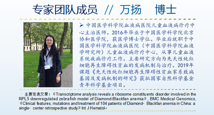 中国医学科学院血液病医院(中国医学科学院血液学研究所)儿童血液病诊疗中心主任,主任医师,博士生导师。首届中国研究型医院学会罕见病分会理事、中国医学科学院北京协和医学院第七届学术委员会委员、中国医师学会儿科医师分会第一届儿童血液肿瘤专业委员会(学组)副主任委员、中国抗癌协会小儿肿瘤专业委员会第七届委员会常务委员、中国抗癌协会小儿肿瘤专业委员会内科学组常务委员、天津市抗癌协会儿童肿瘤专业委员会副主任委员、天津市抗癌协会血液肿瘤专业委员会第一届委员会常务委员、天津市医学会儿科学分会第九届委员会委员,为《中华血液学杂志》、《中华儿科杂志》等7种国内核心期刊杂志编委。自工作以来,积极投身于儿童血液病的诊断、治疗及发病机制研究中。承担天津市科技计划项目一项、国家自然科学基金面上项目三项、国家重大科学研究计划一项、卫生部部属(管)医院临床学科重点项目分课题负责人一项。以第一作者或通讯作者在国内核心期刊发表论文200余篇、SCI论文20余篇,其中更有在《Nature Genetics》、《Blood》等国际顶级杂志发表论文多篇。其科研成果获天津市自然科学一等奖一项和科技进步三等奖2项,获得2017年获五洲女子科技奖-临床医学科研创新奖及2019年宋庆龄医学奖,在儿童血液系统疾病的诊治及发病机制研究中做出了卓越的贡献。