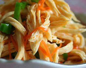 2.味精事先用水化开,同酱油、精盐、米醋一起浇在腐竹菜上,再加香油拌匀即成。