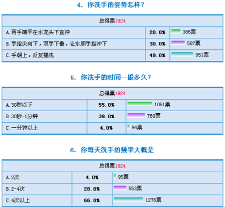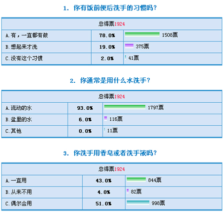人们常讲“病从口入”,我们每天都用手做很多事情,人的一只手上大约沾附有40多万个细菌,生活中,有些人手一闲下来,就抠鼻子、揉眼睛,这样可能造成鼻子、眼睛黏膜的破损,使呼吸道中的病菌、手上的病菌乘虚而入。在现实生活中,相当多的人在洗手时陷入了误区,为此,网易健康对于大家的洗手方式作了一项调查,此次调查中收集有效投票1924票。