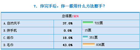 对于洗手的频率,6成以上的人每天洗手在4次以上,而43%的人选择了用毛巾将手擦干,37%的人选择了自然风干,18%的人选择了用纸巾,在参加投票的1924人中,仅有15人是用烘手机将手弄干。专家提醒,每次洗完手后,注意要用清洁的干毛巾或纸巾擦干,最好不要烘干,因为表面水的快速挥发会导致皮肤部分失水,造成皮肤发干,变得粗糙。